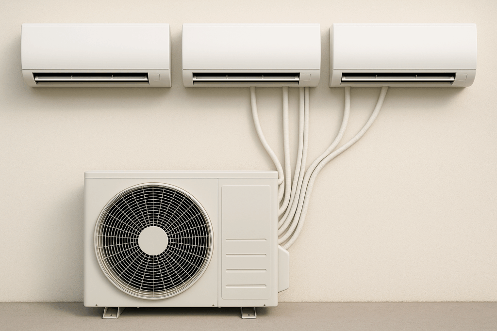 Multi-Split-Klimaanlagen verbinden ein Außengerät mit mehreren Innengeräten. Damit können gleich mehrere Räume individuell gekühlt oder beheizt werden. Sie sind platzsparend, energieeffizient und ideal für Häuser oder Büros.