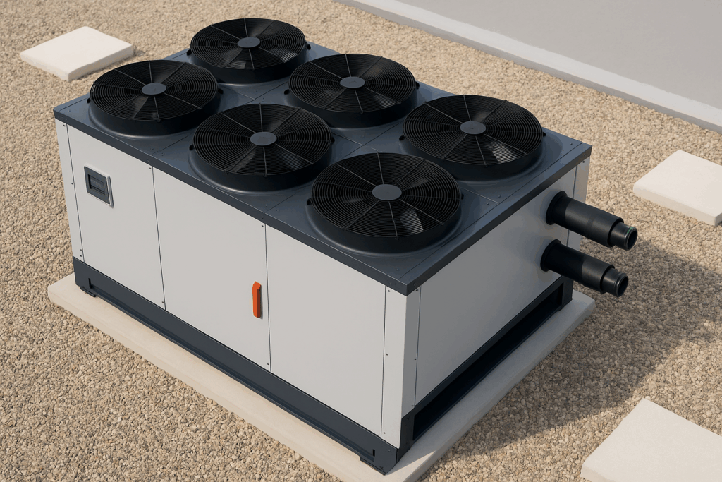 Kaltwassersätze erzeugen kaltes Wasser, das über Leitungen zur Kühlung von Gebäuden eingesetzt wird. Sie sind besonders für große Flächen oder komplexe Anlagen geeignet und bieten effiziente Klimatisierung für Industrie und Büros.